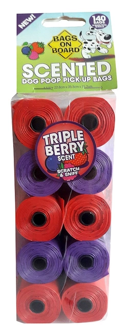 Bags on Board Triple Berry - worki perfumowane owocoweW zestawie 10 rolek po 14 sztuk - łącznie 140 workw.Rozmiar pojedynczego worka: 22,8 x 35,5 cmWorki pachnące mieszanką owocw (jagoda, truskawka, malina)Worki na odchody są niezbędne podczas spacerw z psem. Pozwalają zadbać o nasze otoczenie. Doskonale sprawdzają się na krtkim spacerze i w dłuższej podrży.Pomagają w prosty sposb posprzątać psie odchody i zadbać o czystość wsplnej przestrzeni - dzięki nim zachowasz higienę rąk i otoczenia.Unikalna technologia wytworzenia workw sprawia, że neutralizują nieprzyjemny zapach odchodw.Duży rozmiar pojedynczego worka zapewnia odpowiednią przestrzeń aby bez problemu posprzątać odchody oraz zamknąć worek.Worki są wystarczająco grube, aby zminimalizować wrażenie bezpośredniego dotykania odchodw oraz gwarantują 100% szczelność.Rolki mają szerokość 6 cm i pasują do większości podajnikw na worki.Z workami Bags on Board spacery z psem to czysta przyjemność!