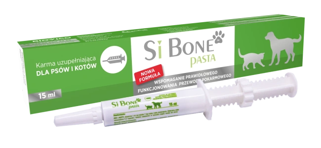 SiBone™ pasta wspomaga przywrócenie równowagi funkcji przewodu pokarmowego, wykazuje szybkie działanie w przypadku ostrych zaburzeń wchłaniania jelitowego i biegunek; wzmacnia integralność bariery jelitowej, hamuje rozwój bakterii chorobotwórczych. SiBone™ pasta to wyjątkowa formuła zawierająca: prebiotyki (fruktooligosacharydy o krótkich łańcuchach scFOS oraz mannanooligosacharydy MOS) oraz probiotyki (Enterococcus faecium).