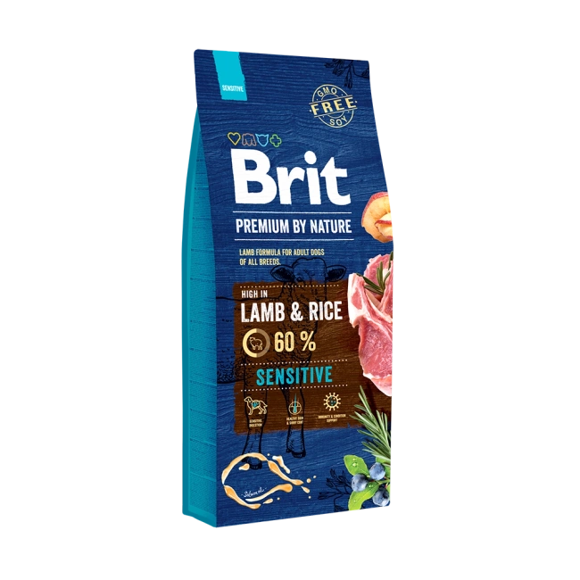 Brit Premium By Nature Sensitive to pełnoporcjowa sucha karma z jagnięciną i ryżem, przeznaczona dla dorosłych psów wszystkich ras z wrażliwym przewodem pokarmowym.