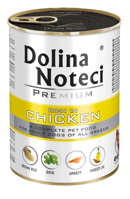 Karma Dolina Noteci PREMIUM bogata w kurczaka dla psów dorosłych wszystkich ras, jest cennym źródłem fenyloalaniny, lizyny i leucyny. Ponadto mięso z kurczaka stanowi źródło cynku i selenu – składników mineralnych odgrywających istotną rolę w pobudzaniu funkcji obronnych organizmu. Stymulują one również właściwości przeciwutleniające płynów ustrojowych oraz odgrywają istotną rolę w regulacji funkcji skóry. Karma jest także źródłem niacyny i ryboflawiny, które wpływają na metabolizm. Dzięki zastosowaniu mięsa z kurczaka skład kwasów tłuszczowych jest bardzo korzystny i jako jeden z nielicznych zawiera dużą ilość kwasów tłuszczowych n-6 wpływających na kondycję skóry i poprawiających wygląd sierści.
