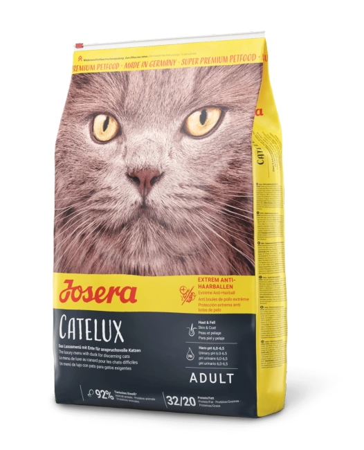 Sucha karma dla dorosłego kota Josera Catelux 10kg powstała z myślą o zwierzętach, które mają tendencję do połykania sporej ilości sierści. Unikalne włókna dietetyczne pomagają usuwać włosy z przewodu pokarmowego i przeciwdziałają formowaniu się kul. Odpowiednio zbilansowane oleje, tłuszcze, witaminy i minerały nie tylko wyraźnie podnoszą odporność na choroby, ale dodają również energii do zabawy. Zastosowane w tej karmie specjalne dietetyczne włókna pomagają usuwać te włosy i zapobiegają tworzeniu się kul. Wolna od różnego rodzaju sztucznych barwników, konserwantów składająca się z wysokowartościowych, zdrowych i naturalnych składników. Składniki użyte przy produkcji karmy wpływają na skórę i sierść kotów.