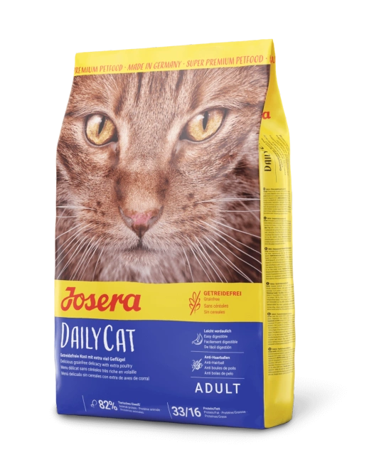 Josera DailyCat to bezzbożowa karma dla kotów ze specjalnym błonnikiem pokarmowym, który przeciwdziała kulom włosowym. Przeznaczona dla dorosłych kotów z wrażliwym układem pokarmowym. Codzienna dodatkowa porcja pysznego drobiu. Zawiera wartościowe kwasy tłuszczowe, witaminy i mikroelementy dla zdrowej skóry oraz lśniącej sierści oraz właściwie dobrane zioła i owoce wzbogacają recepturę i zapewniają wyjątkowe, różnorodne doznania smakowe.