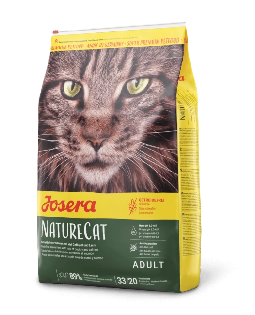 Wybranie odpowiedniej karmy dla kotów, których żołądki są wrażliwe na niektóre składniki znajdujące się w składach karm wymaga od nas analizy produktów co przekłada się czasami na poświęcenie sporej ilości czasu na to zadanie. Z pomocą przychodzi karma Josera Nature Cat dla dorosłych kotów. To wysokowartościowa, lekkostrawna, w pełni zbilansowana karma powstała ze specjalnej receptury nie wymagającej użycia przy jej produkcji zbóż. Karma wolna jest od różnego rodzaju sztucznych barwników i konserwantów. Składa się z wysokowartościowych, zdrowych i naturalnych składników. Idealny mix ziół, owoców i warzyw. W skład karmy wchodzi również drób (29%) i łosoś. Krokieciki pozbawione są składników z potencjałem alergennym. Kształt i wielkość krokiecików zostały dobrane tak, by przeżuwanie nie sprawiało problemów wszystkim kotom. Ograniczy to prawdopodobieństwo wystąpienia problemów trawiennych. Składniki użyte przy tworzeniu produktu mają pozytywny wpływ na skórę i sierść zwierzaka. Wspomagają również wydalanie połkniętej sierści.