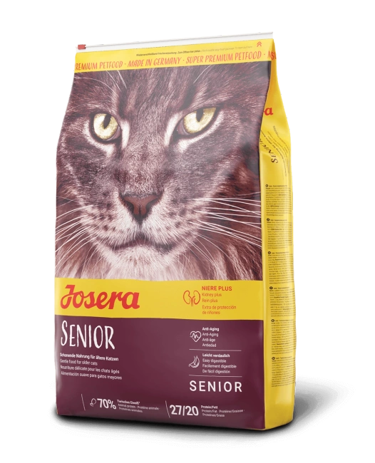 Josera Senior to karma stworzona specjalnie na potrzeby kotów cierpiących na problemy z nerkami, a w szczególności tych z niewydolnością narządu, jak również dla tych będących już w podeszłym wieku. Dla takich kotów ważne jest, aby pokarm był lekkostrawny i wysoko przyswajalny. Karma wolna jest od różnego rodzaju sztucznych barwników, konserwantów składająca się z wysokowartościowych, zdrowych i naturalnych składników Składniki użyte przy produkcji karmy wpływają na skórę i sierść kotów. Karma pozbawiona jest składników z potencjałem alergennym.